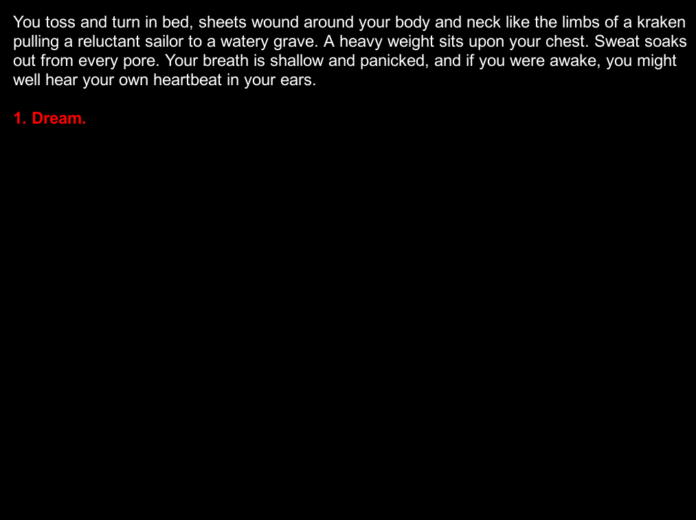 A short and deeply personal interactive diary. Drift through the dreams of a person at a critical and difficult moment in their lives. Sleep the fitful sleep of memories.